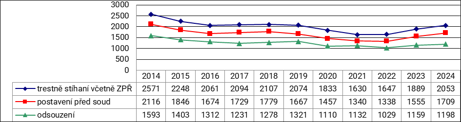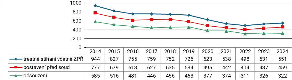 Také v případě mladistvých došlo na počátku sledovaného období k výraznějšímu poklesu jejich počtů v rámci systému soudnictví ve věcech mládeže, a to ve všech sledovaných kategoriích. Od roku 2016 dochází ke stabilizaci jejich počtů. Výrazný pokles, obdobně jako obecně u fyzických osob, je patrný v covidovém období. V roce 2022 se počty stíhaných mladistvých (včetně mladistvých v ZPŘ) a mladistvých postavených před soud prakticky nemění, počty odsouzených dále klesají. Zde se patrně více než u dospělých projevil vliv dekriminalizace v oblasti majetkové kriminality. Od roku 2023 již počty mladistvých ve všech sledovaných kategoriích narůstají. V roce 2024 počty stíhaných mladistvých a mladistvých postavených před soud přibližně dosahují úrovně před pandemií covid-19. Počty odsouzených mladistvých jsou i v roce 2024 výrazně nižší (Graf 3).