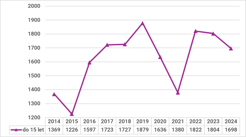 Graf 15: Vývoj počtu známých pachatelů do 15 let v letech 2014–2024