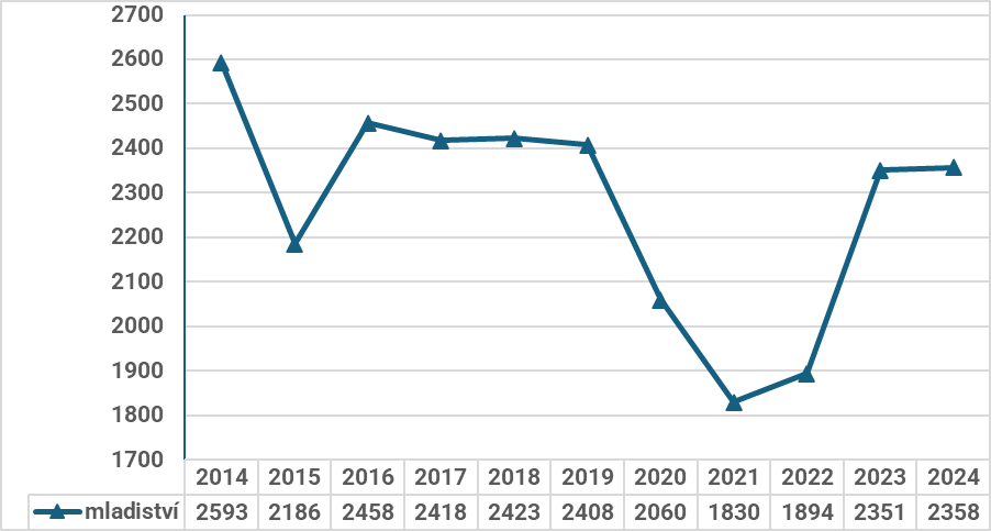 Osoby do 18 let věku tvoří stabilně 5 % ze všech stíhaných osob.  Absolutní počty pachatelů v této kategorii (tedy do 18 let) se po výrazném propadu v covidových letech vracely v letech 2022 a 2023 na úroveň období kolem let 2017, 2018. Rok 2024 naopak přinesl klesající křivku. V zobrazení Grafu 14 jsou za účelem názornosti pro sledování trendu užita dvě různá měřítka.