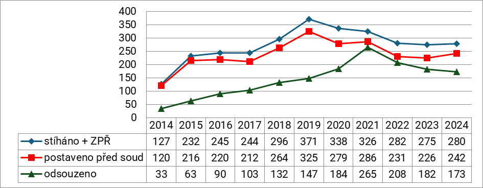 Nízké počty stíhaných právnických osob (včetně ZPŘ), právnických osob postavených před soud a odsouzených na počátku sledovaného období souvisí s tím, že se jednalo dosud o poměrně krátkou dobu od zakotvení trestní odpovědnost právnických osob, s účinností od 1. 1. 2012. Poměrně výrazný nárůst počtů stíhaných právnických osob (včetně ZPŘ) a právnických osob postavených před soud je patrný mezi roky 2014–2015. Poté se jejich počty poměrně stabilizují až do roku 2017. V letech 2018 a 2019 (Graf 5) dochází opět k jejich k výraznému nárůstu. Zde patrně mohla mít vliv novelizace zákona o trestní odpovědnosti právnických osob a řízení proti nim zákonem č. 183/2016 Sb., s účinností od 1. 12. 2016, kdy došlo k rozšíření okruhu trestných činů, u kterých lze vyvozovat trestní odpovědnost právnických osob. Od roku 2020 jejich počty převážně opět klesají. I zde se mohla projevit situace spojená s covidovým obdobím. Od roku 2022 je patrná určitá stabilizace jejich počtů. Nicméně jejich počty nedosahují úrovně v roce 2019. V roce 2024 lze zaznamenat u stíhaných právnických osob zcela zanedbatelný a u právnických osob postavených před soud ne příliš výrazný nárůst jejich počtů. U odsouzených právnických osob lze pozorovat pozvolný narůstající trend až do roku 2021. Poté jejich počty stále klesají, a to i v roce 2024.
