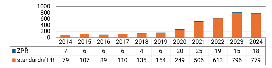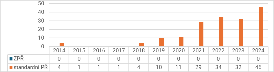 Pokud jde o aplikaci dohod o vině a trestu u právnických osob, do roku 2018 se tyto návrhy na schválení dohody o vině a trestu téměř neaplikovali. Poté dochází k nárůstu jejich využívání, výrazně od roku 2021, což lze opět dát do souvislosti s výše zmíněnou novelizací TrŘ. Pak dochází k určité stabilizaci. Nicméně v roce 2024 jejich počet opět výrazněji narostl a zvýšil se i jejich podíl na celkovém počtu stíhaných právnických osob (včetně ZPŘ) na 16 % - v předchozích dvou letech to bylo 12 %. Zároveň po celé sledované období nebyly aplikovány ve zkráceném přípravném řízení.