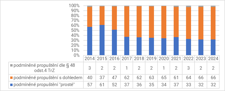 Pramen: Výkazy o agendě podmíněného propuštění, Přehledy soudních agend, Ministerstvo spravedlnosti, CSLAV