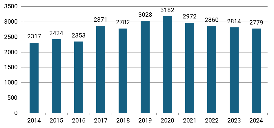 V případě přeměn alternativních trestů dochází po roce 2014, kde je počet přeměn poměrně nízký, což zřejmě ještě souvisí s vlivem amnestie prezidenta republiky, k jejich výraznému nárůstu. Od roku 2017 lze zaznamenat pozvolný pokles, který trvá až do roku 2020, což zřejmě souvisí s opatřeními v době pandemie covid-19. Poté se opět počty přeměn navracejí k úrovni před pandemií. V roce 2024 lze zaznamenat mírný pokles vzhledem k předchozímu roku. Obecně lze shrnout, že počty přeměn v druhé polovině sledovaného období jsou převážně nižší než v období před pandemií covid-19. Zde je třeba poukázat na to, že v tomto období jsou nižší i počty odsouzených osob (blíže Graf 1).